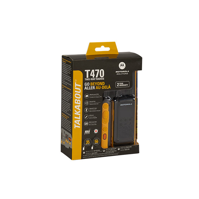 The TALKABOUT T470 is the rugged travel companion you need. With an IPX4 rating, the T470 is weatherproof - able to withstand harsh environments. A built-in LED flashlight makes its possible to get where you need to in the dark. The Quiet Charge feature allows T470 to receive NOAA weather/emergency alerts while keeping calls silent during charge. And with essential accessories and a range of up to 56km, the TALKABOUT T470 keeps you in touch whether you’re on the roughest treks or highest peaks.